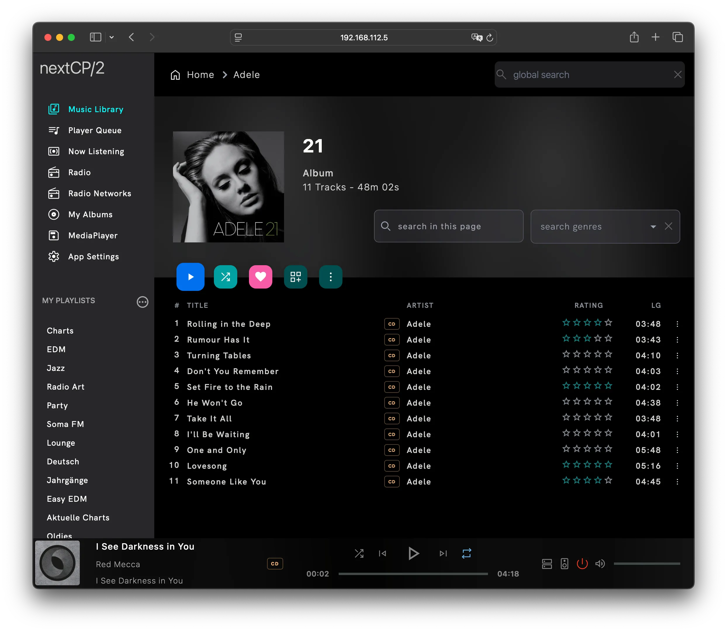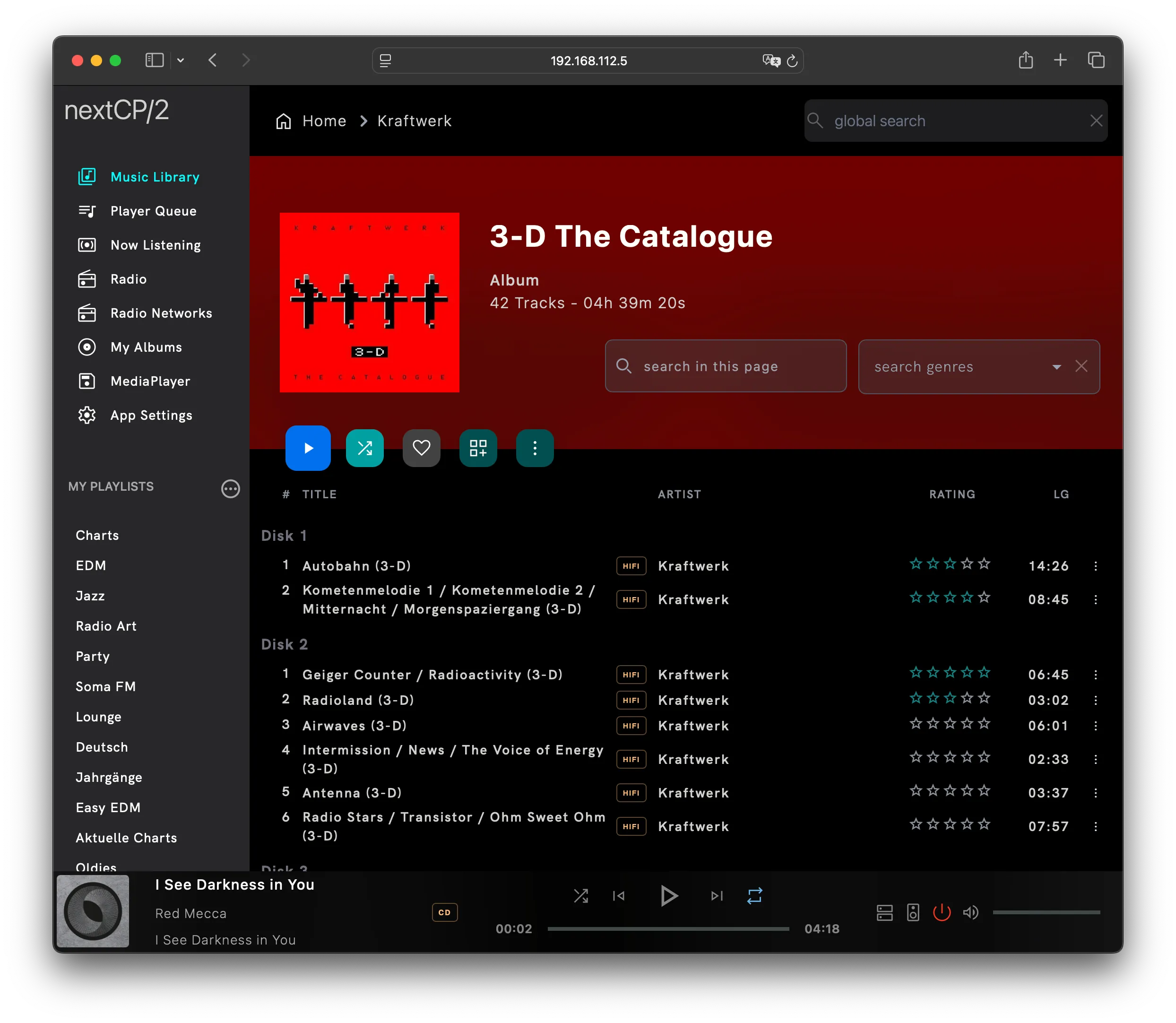 If the album is identified by a MusicBrainz Release ID, the like/dislike feature (heart icon) becomes available. Albums you mark as liked can then be quickly accessed from the My Albums section in the sidebar.