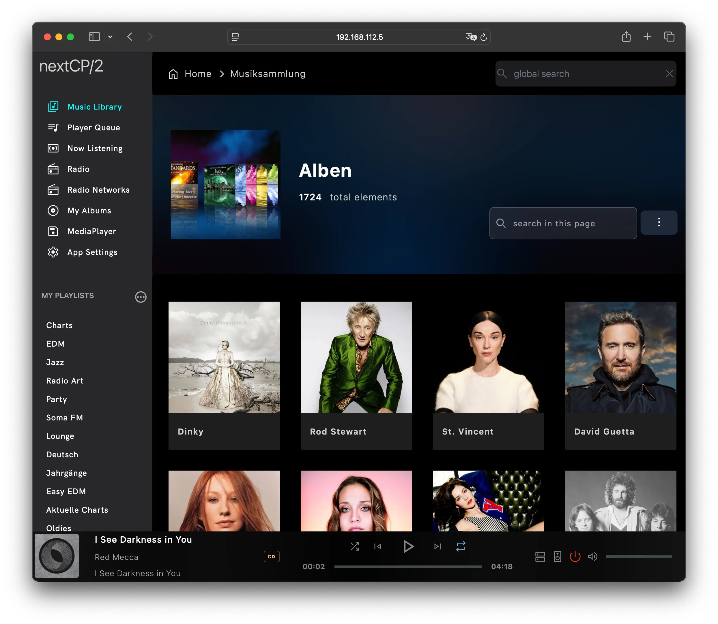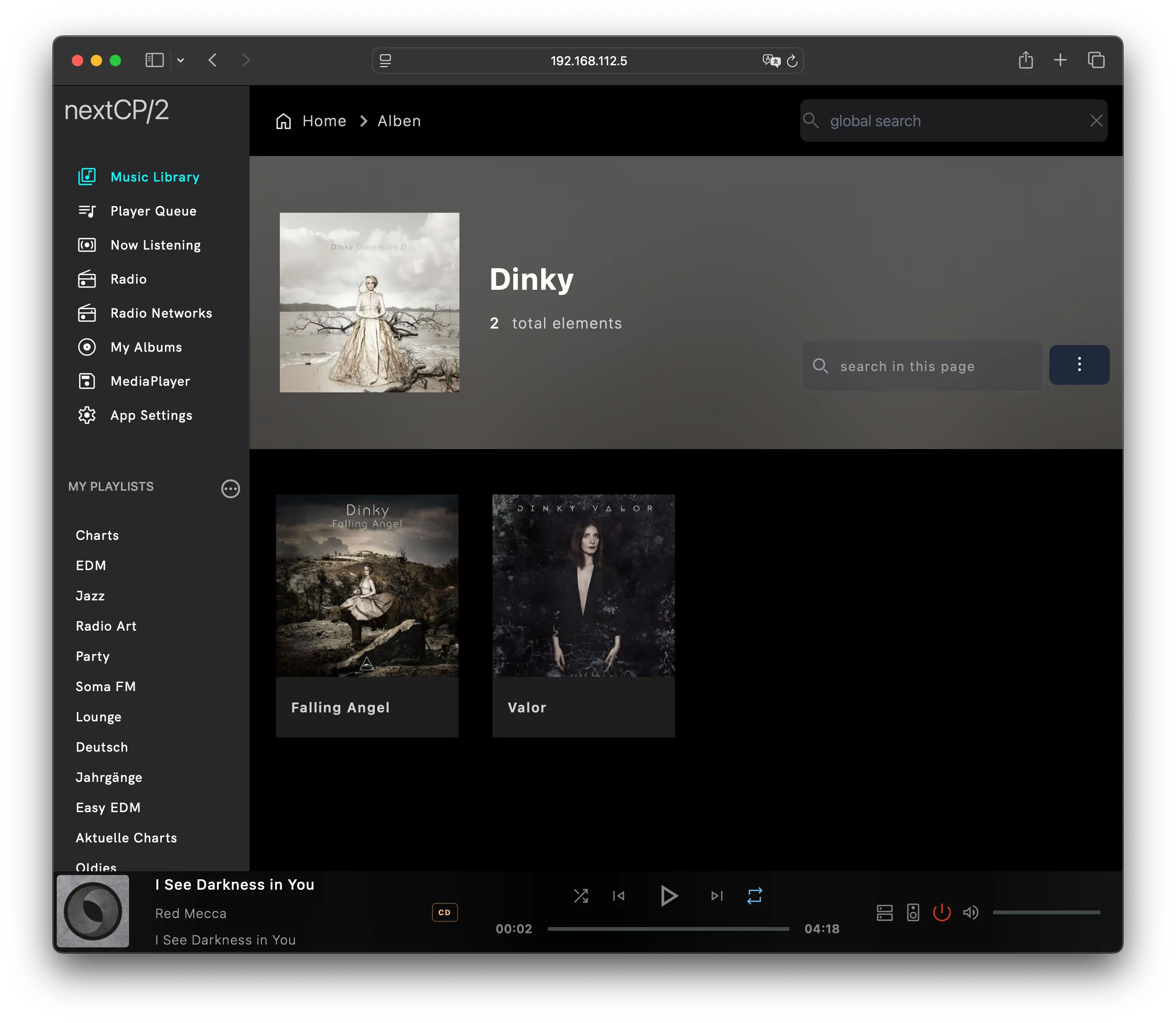 Known media servers with compatible UPnP search capabilities include MinimServer and Universal Media Server (since 10.6.0). The search text is matched against tracks, albums, playlists, and artists. Artist covers are retrieved from Spotify if a connected account is available.