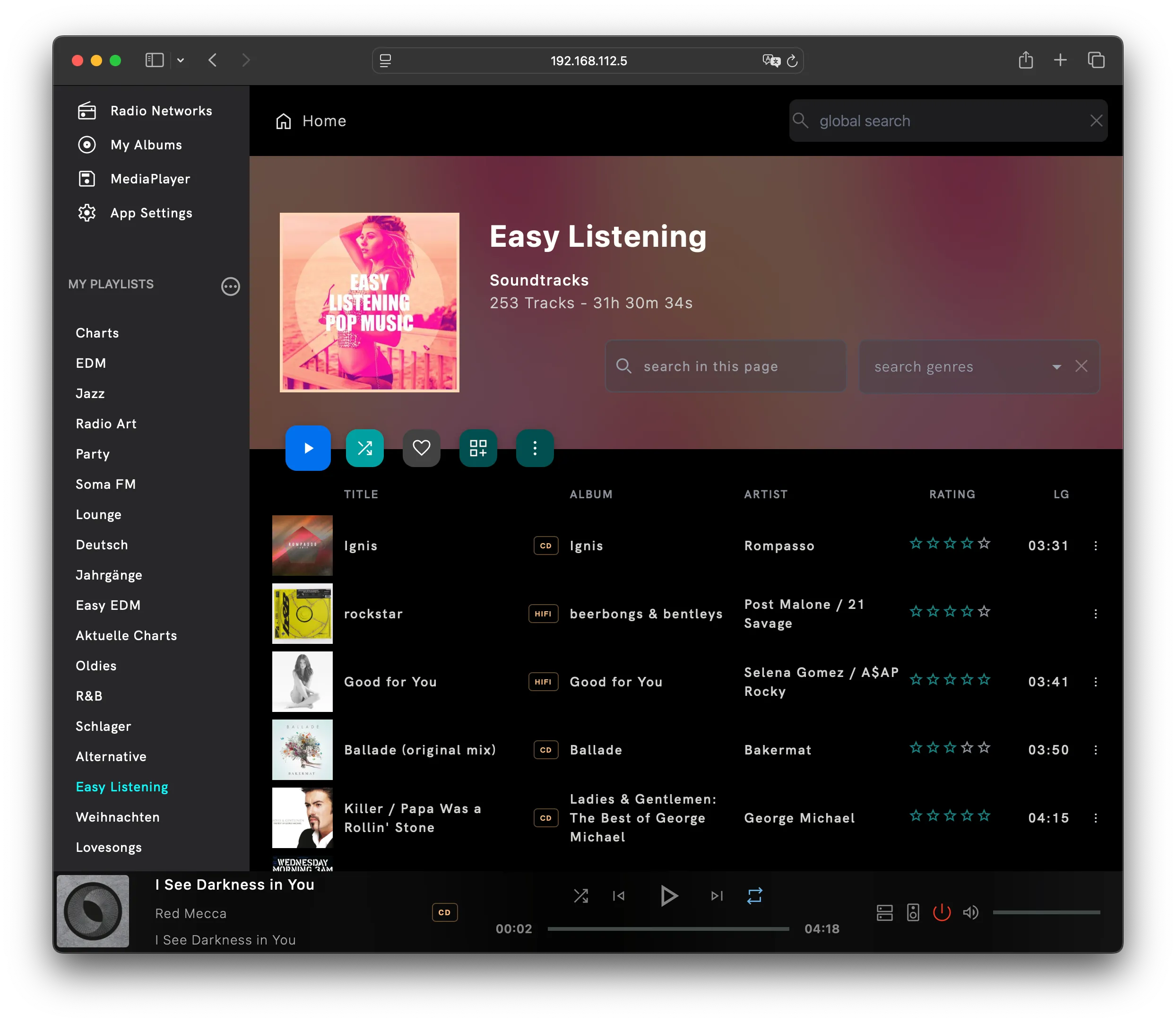 When browsing server-based playlists, the display automatically switches to a track view with small album covers. Clicking Switch View will change the display to a full-sized album view.