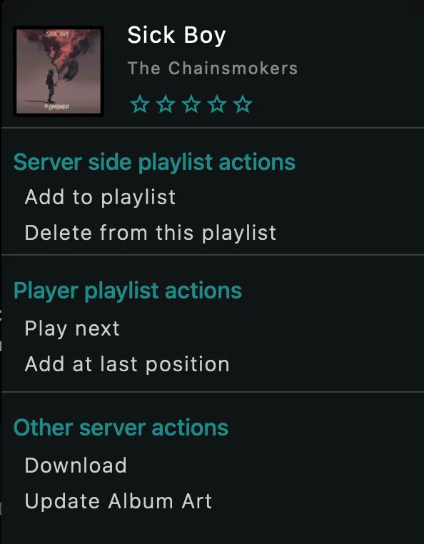 Clicking the three-dot menu next to a song opens the Song Options dialog. Where you can choose between server side actions and media player actions.