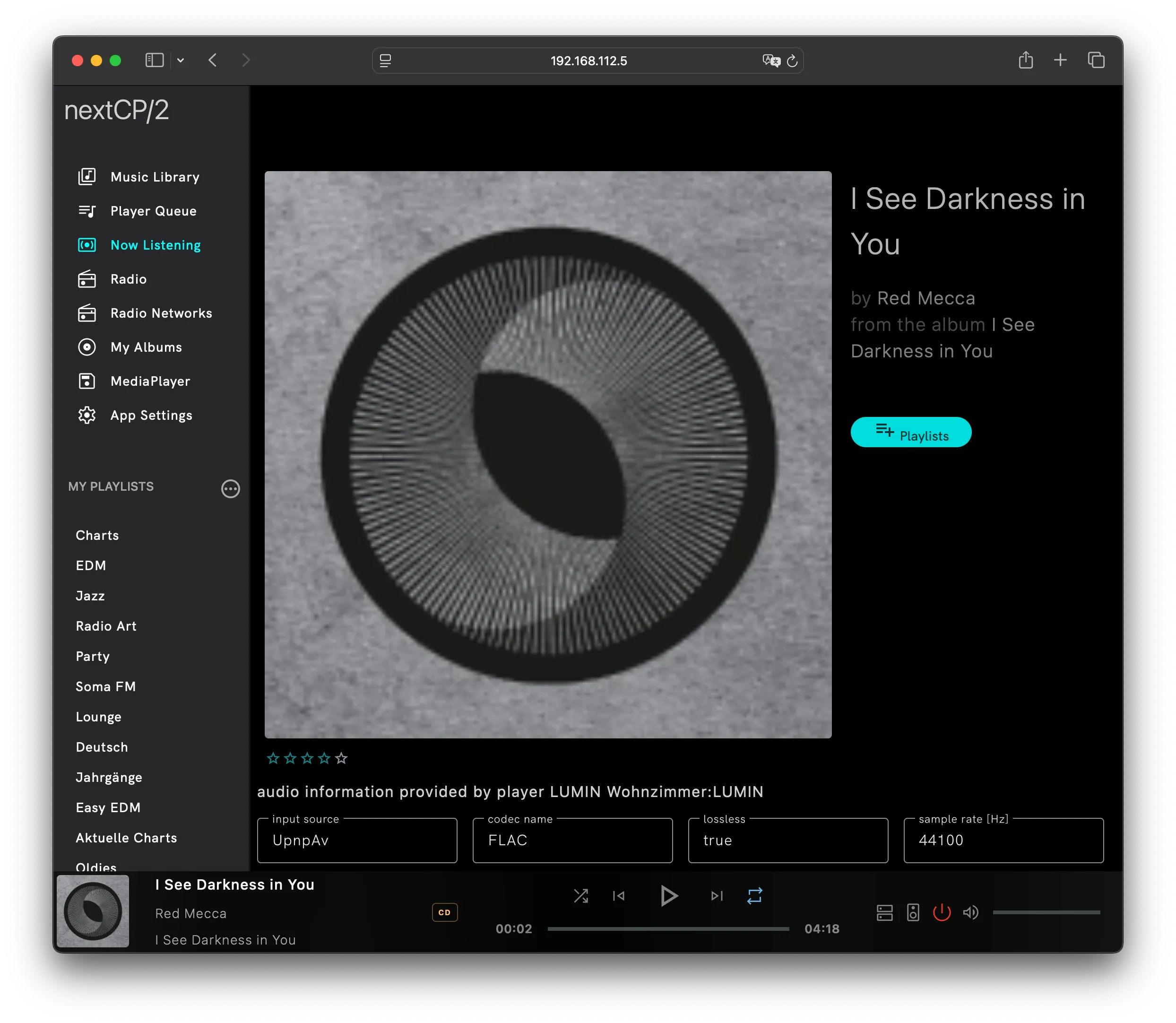 Displays currently active player song. Song can be added to server playlist or star rated.