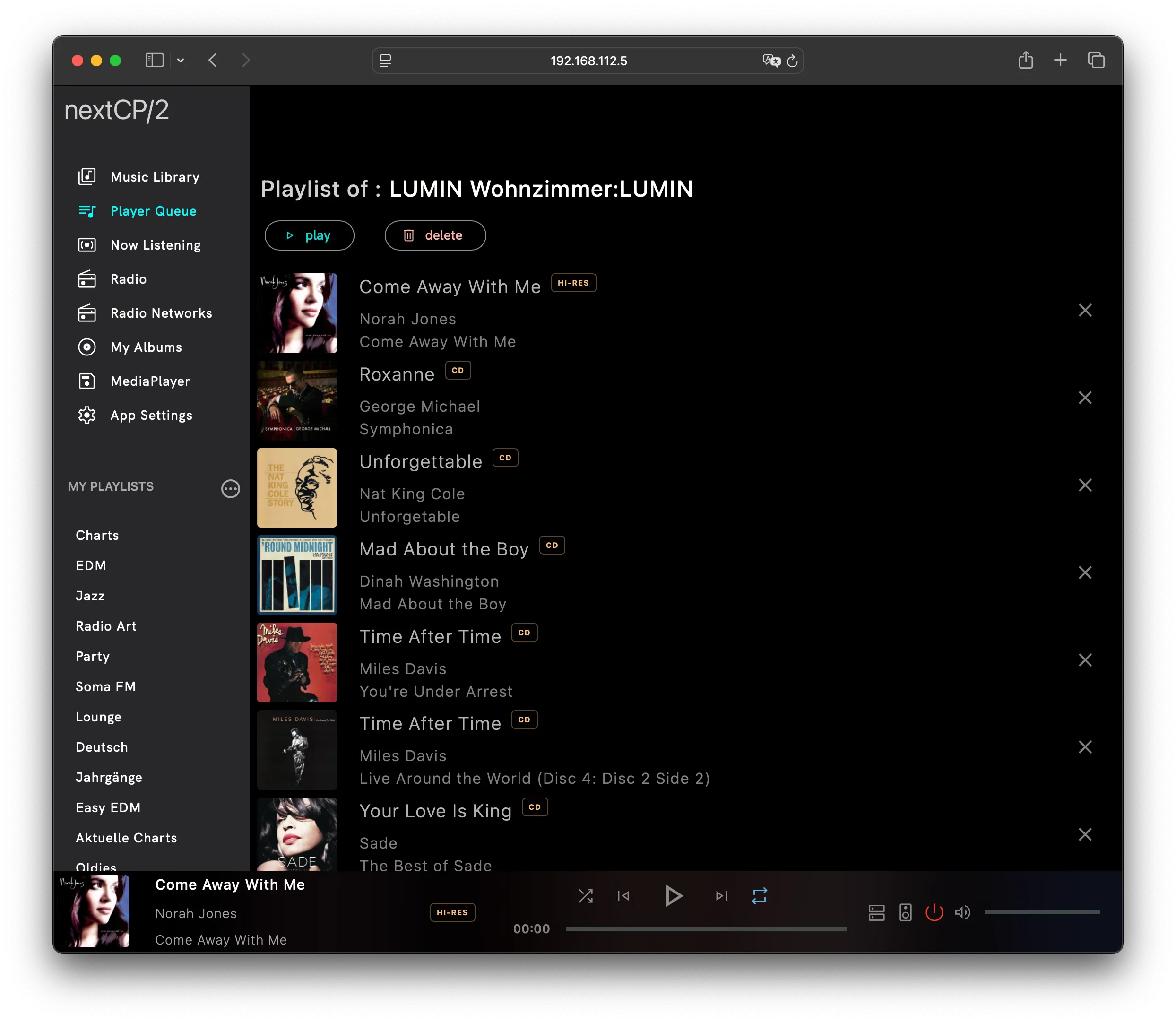 Displays playlist of currently active media player. The active song is highlighted. NextCP/2 supports native OpenHome playlists, as well as self managed playlist for regular UPnP devices without internal playlist support.